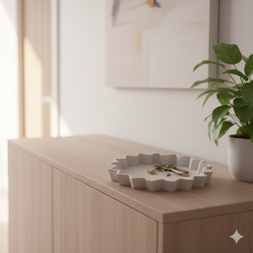 Die Schlüsselschale Runa verbindet Funktionalität mit modernem Design. Ihre klare, geometrische Form und die weichen Kanten schaffen ein harmonisches Gleichgewicht zwischen Struktur und Ruhe – perfekt für den Eingangsbereich, den Schreibtisch oder das Sideboard.