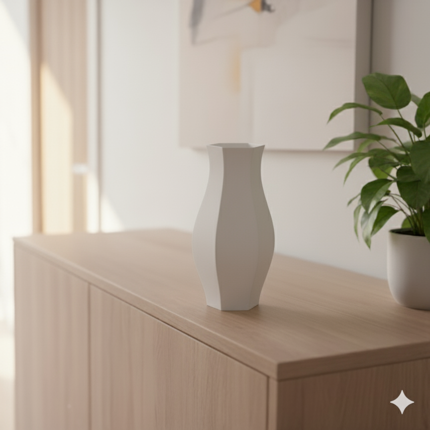 Gefertigt aus hochwertigem, 3D-gedrucktem Material steht sie für Nachhaltigkeit und modernes Design in perfekter Balance. Die matte Oberfläche verleiht der Vase eine edle Haptik und sorgt für ein harmonisches Erscheinungsbild in jedem Raum.